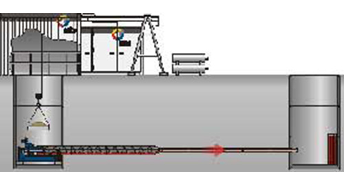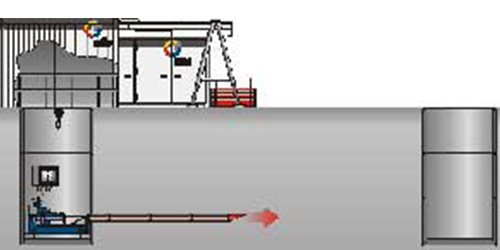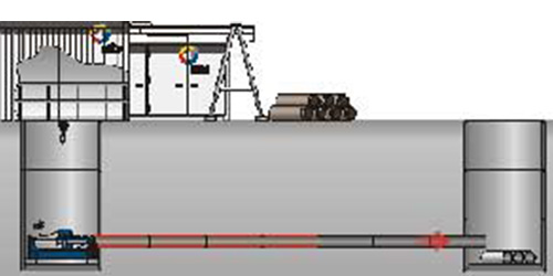 Rohreinzug: In der letzten Phase wird das eigentliche Produkt- oder Mantelrohr (z. B. aus Steinzeug, Stahlbeton, GFK oder Stahl) in den vorbereiteten Kanal eingezogen oder eingepresst. Gleichzeitig wird das Pilotgestänge auf der Zielseite demontiert oder herausgezogen.